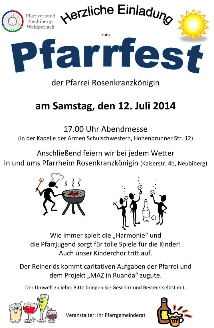 Die Pfarrei Rosenkranzkönigin Neubiberg lädt groß und klein, jung und alt zu ihrem Pfarrfest am 12. Juli 2014 herzlich ein. Aufgrund der Umbauarbeiten an der Kirche Rosenkranzkönigin beginnt das Fest mit einem feierlichen Gottesdienst um 17.00 Uhr in der Kapelle der Armen Schulschwestern in der Hohenbrunner Straße 12. Anschließend wird in und um das Pfarrheim in der Kaiserstraße 4b fröhlich gefeiert mit leckeren Kuchen und Schmankerln vom Grill, Beginn ca. 18.00 Uhr. Die Neubiberger Harmonie spielt gewohnt gut und zünftig auf und es singt der Kinderchor der Pfarrei Rosenkranzkönigin. Die kleinen Gäste können sich auf Spiel und Spaß mit der Pfarrjugend freuen. Der Reinerlös des Pfarrfestes kommt neben caritativen Aufgaben der Pfarrei dem Missionsprojekt in Ruanda, in dem unsere Pfarrjugendleiterin Frau Sabrina Windemuth ab August für ein Jahr als Missionarin auf Zeit mitarbeiten will, zugute. Bitte der Umwelt zuliebe Geschirr und Besteck mitbringen!