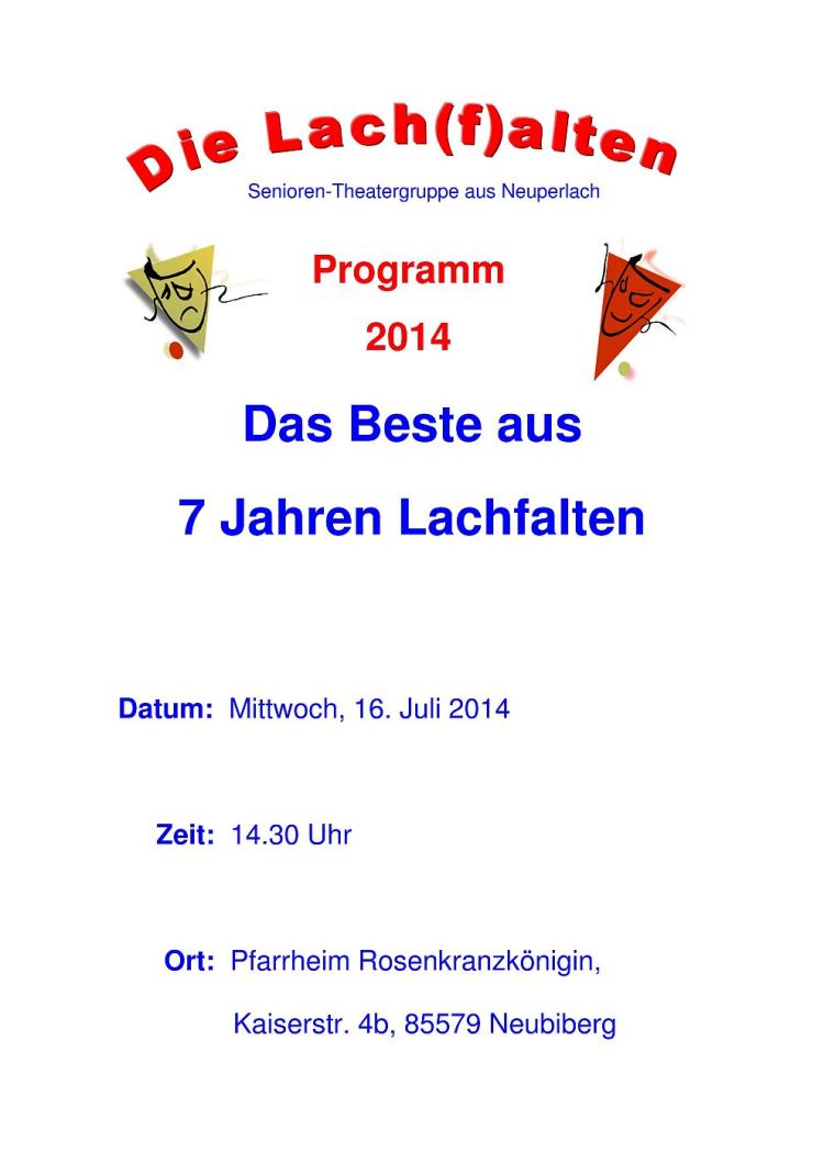 Die Senioren-Theatergruppe "Die Lachfaltern" aus Neuperlach kommt mit Ihrem Programm 2014 am 16.07.2014 um 14.30 Uhr ins Pfarrheim Rosenkranzkönigin, Kaiserstraße 4b, 85579 Neubiberg. Unter dem Motto "Das Beste aus 7 Jahren Lachfalten" wird durch kurzweilige Unterhaltung der Nachmittag zu einem Höhepunkt im Jahresprogramm unserer Senioren.
