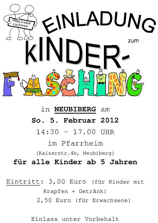 Herzliche Einladung zum Kinderfasching am Sonntag, den 01.02.2015, um 14:00 Uhr Einlass: 14:00 Uhr Beginn: 14:30 Uhr Ort: Pfarrheim der Pfarrei Rosenkranzkönigin (Kaiserstraße 4b, 85579 Neubiberg) Zielgruppe: Alle Kinder ab 5 Jahren Eintritt: 3,00 EUR für Kinder (inkl. Krapfen und ... mehr
