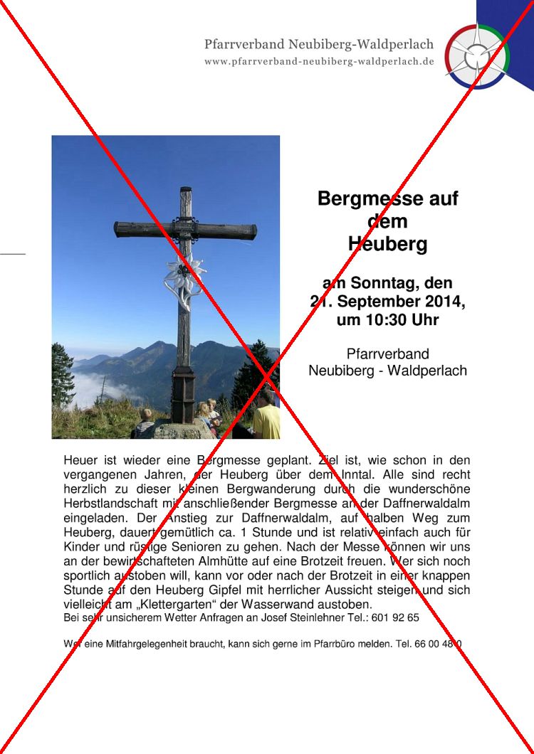 Heuer ist wieder eine Bergmesse geplant. Ziel ist wie schon in den vergangenen Jahren der Heuberg über dem Inntal. Alle sind recht herzlich zu dieser kleinen Bergwanderung durch die wunderschöne Herbstlandschaft mit anschließender Bergmesse an der Daffnerwaldalm eingeladen.