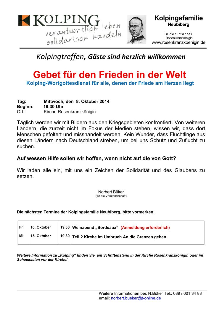 Referentin: Msgr. Christoph Huber, Präses Kolpingwerk Bayern Ort: Katholisches Pfarrheim, Kaiserstraße 4b, Neubiberg