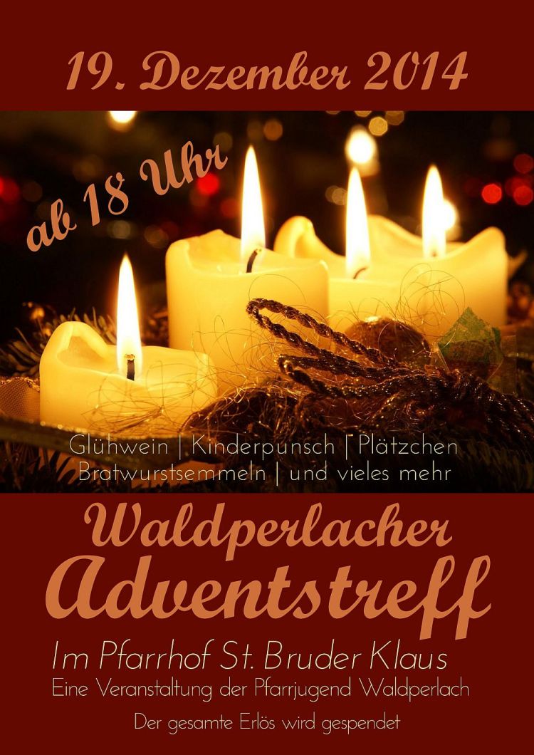 Wie auch in den letzten Jahren bietet die Pfarrjugend der Gemeinde St. Bruder Klaus am Freitag, 19.12.2014 ab 18.00 Uhr einen gemütlichen Adventstreff im Pfarrhof vor der Kirche von St. Bruder Klaus, Putzbrunner Straße 274 in München Waldperlach an. Hier kann man die Woche ruhig ausklingen lassen und sich auf eine Tasse Glühwein oder Kinderpunsch mit Freunden und Bekannten treffen. Jung und Alt sind herzlich willkommen.