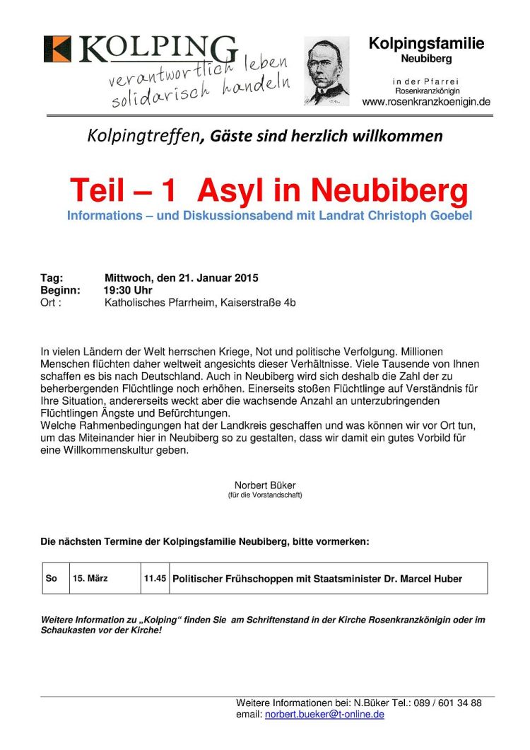 In vielen Ländern der Welt herrschen Kriege, Not und politische Verfolgung. Millionen Menschen flüchten daher weltweit angesichts dieser Verhältnisse. Viele Tausende von Ihnen schaffen es bis nach Deutschland. Auch in Neubiberg wird sich deshalb die Zahl der zu beherbergenden Flüchtlinge noch erhöhen. Einerseits stoßen Flüchtlinge auf Verständnis für Ihre Situation, andererseits weckt aber die wachsende Anzahl an unterzubringenden Flüchtlingen Ängste und Befürchtungen. Welche Rahmenbedingungen hat der Landkreis geschaffen und was können wir vor Ort tun, um das Miteinander hier in Neubiberg so zu gestalten, dass wir damit ein gutes Vorbild für eine Willkommenskultur geben.