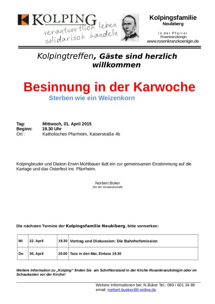 Kolpingbruder und Diakon Erwin Mühlbauer lädt ein zur gemeinsamen Einstimmung auf die Kartage und das Osterfest am Mittwoch, den 1. April 2015, um 19:30 Uhr ins Katholische Pfarrheim Rosenkranzkönigin, Kaiserstraße 4b, Neubiberg. Thema: "Sterben wie ein Weizenkorn"
