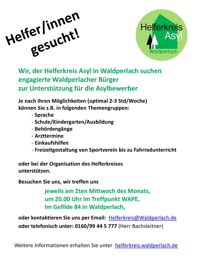 Besuchen Sie uns, wir treffen uns jeweils am 2. Mittwoch des Monats, um 20:00 Uhr im Treffpunkt WAPE, Im Gefilde 84 in Waldperlach, oder kontaktieren Sie uns per Email: helferkreis@waldperlach.de oder telefonisch unter: 0160/99 44 5 777 (Herr Bachsleitner)