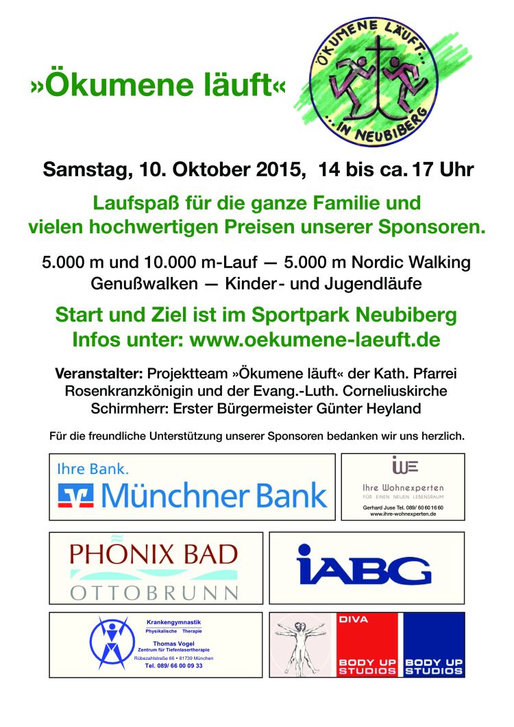 Am Samstag, den 10. Oktober 2015, fällt wieder der Startschuss zu "Ökumene läuft" in Neubiberg (bereits zum 10. Mal)
