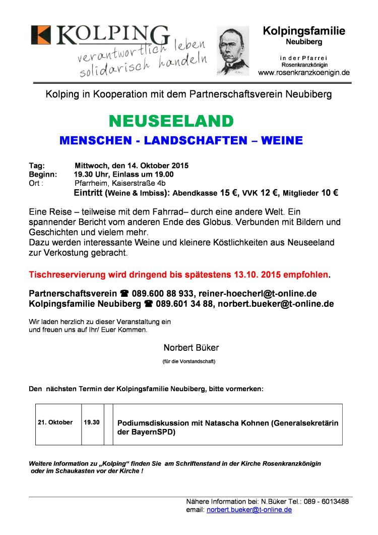 Partnerschaftsverein, Tel. 089/600 88 933, reiner-hoecherl@t-online.de Kolpingsfamilie Neubiberg, Tel. 089/601 34 88, norbert.bueker@t-online.de