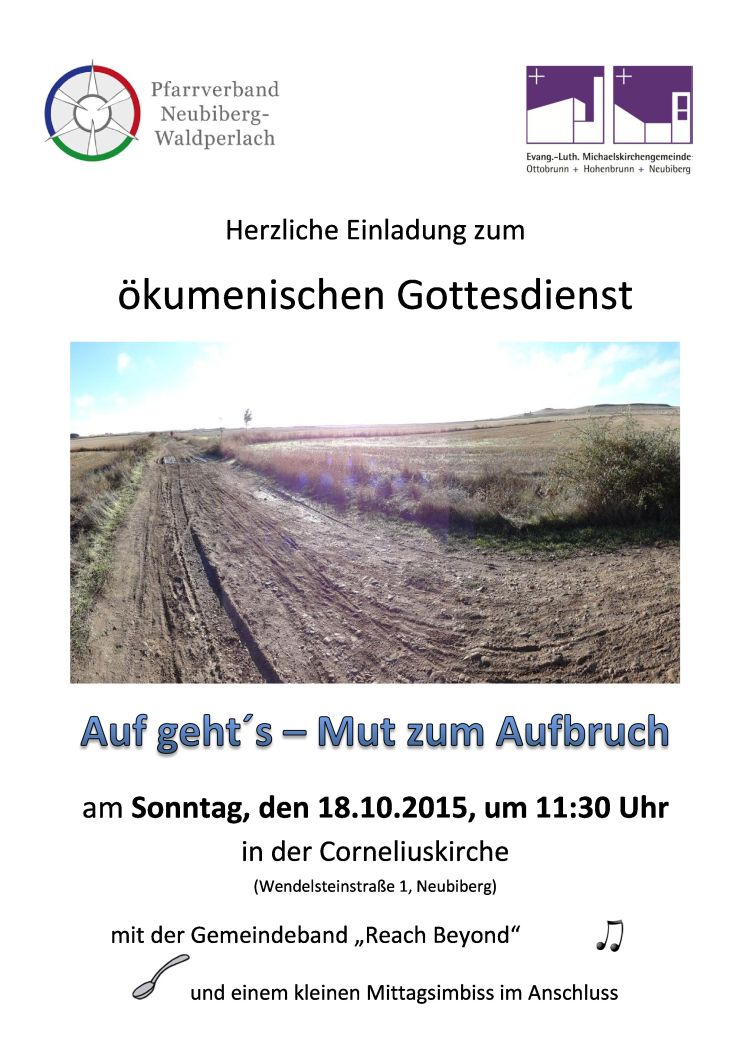 Herzliche Einladung zum ökumenischen Gottesdienst zum Thema "Auf geht's - Mut zum Aufbruch" am Sonntag, den 18.10.2015, um 11:30 Uhr in der Corneliuskirche (Wendelsteinstr. 1, Neubiberg) mit der Gemeindeband "Reach Beyond" und einem kleinen Mittagsimbiss im Anschluss