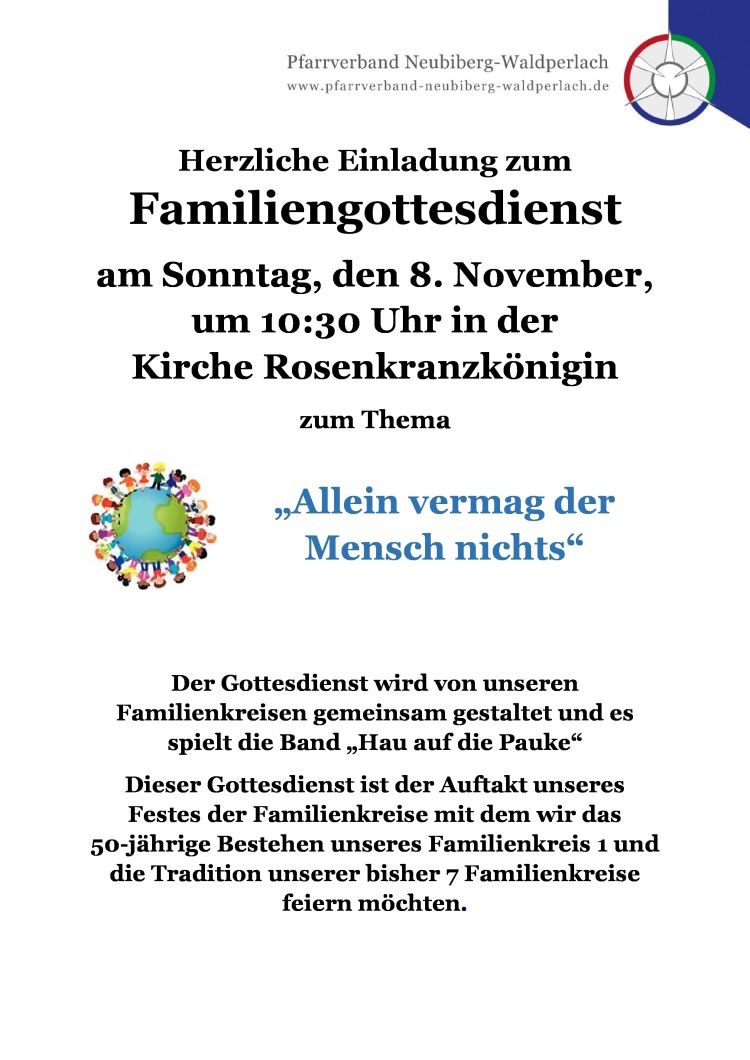 Herzliche Einladung zum Familiengottesdienst am Sonntag, den 8. November, um 10:30 Uhr in der Kirche Rosenkranzkönigin zum Thema