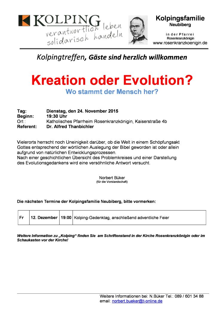 Tag: Dienstag, den 24. November 2015 Beginn: 19:30 Uhr Ort: Katholisches Pfarrheim, Kaiserstraße 4b Referent: Dr. Alfred Thanbichler Vielerorts herrscht noch Uneinigkeit darüber, ob die Welt in einem Schöpfungsakt Gottes entsprechend der wörtlichen Auslegung der Bibel geworden ... mehr