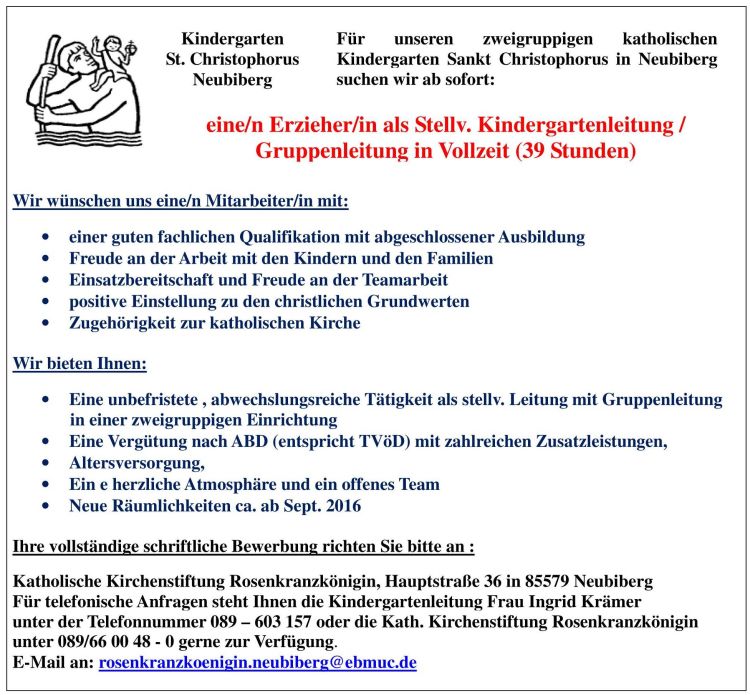 Für unseren zweigruppigen katholischen Kindergarten St. Christophorus in Neubiberg suchen wir ab sofort eine/n Erzieher/in als stellv. Kindergartenleitung / Gruppenleitung in Vollzeit (39 Stunden)