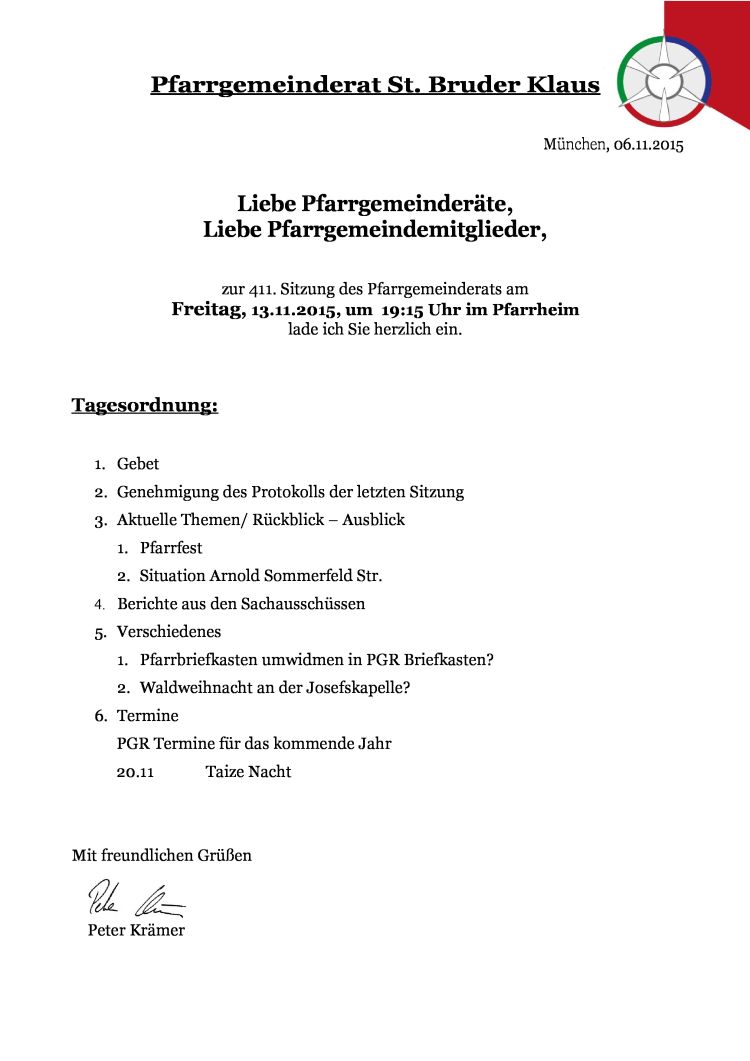 zur 411. Sitzung des Pfarrgemeinderats am Freitag, 13.11.2015, um 19:15 im Pfarrheim St. Bruder Klaus lade ich Sie herzlich ein.