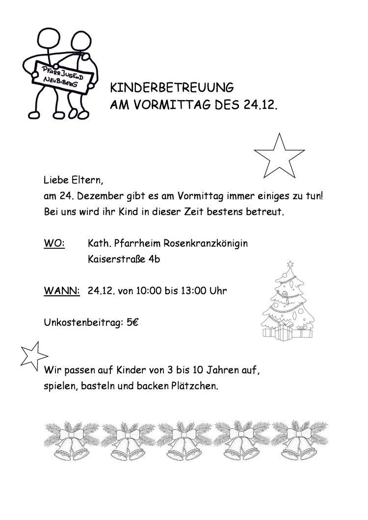 Liebe Eltern, am 24. Dezember gibt es am Vormittag immer einiges zu tun!! Bei uns wird ihr Kind bestens betreut. WO:       Kath. Pfarrheim Rosenkranzkönigin, Kaiserstr. 4b WANN:   24.12. von 10:00 bis 13:00 Uhr Unkostenbeitrag: 5 EUR Wir passen auf Kinder von 3 bis 10 Jahren ... mehr