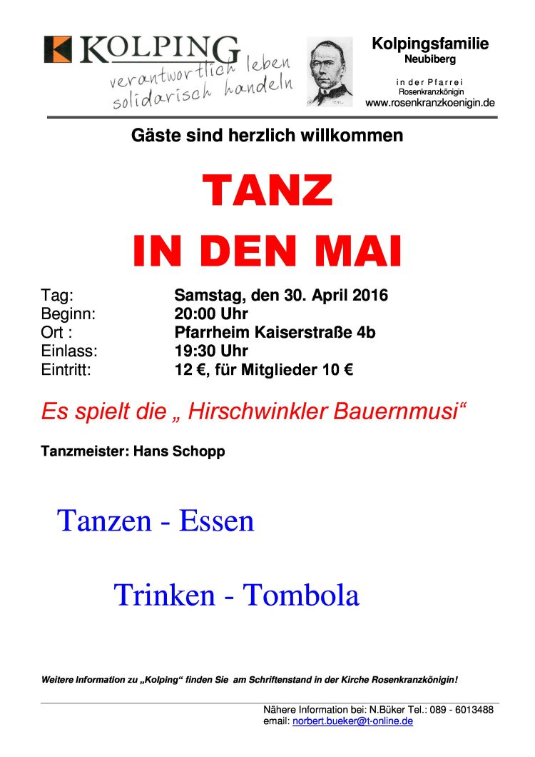 Tag: Samstag, den 30. April 2016 Beginn: 20:00 Uhr Ort: Pfarrheim Rosenkranzkönigin, Kaiserstraße 4b, Neubiberg Einlass: 19:30 Uhr Eintritt: 10 EUR