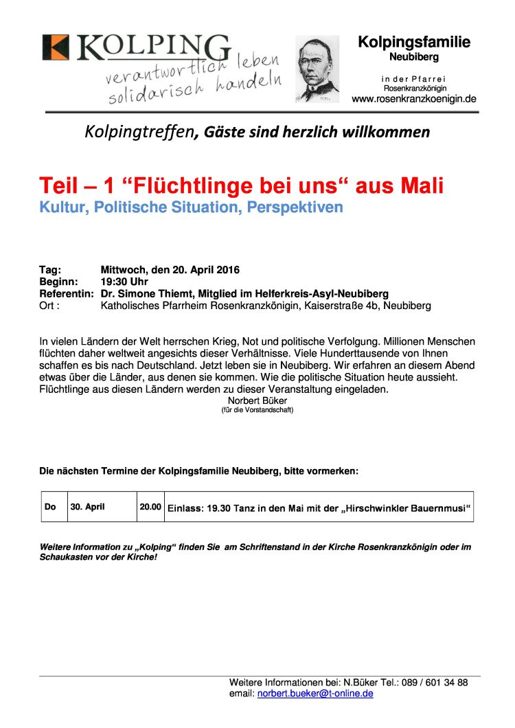 Tag: Mittwoch, den 20. April 2016 Beginn: 19:30 Uhr Referentin: Dr. Simone Thiemt, Mitglied im Helferkreis-Asyl-Neubiberg Ort: Katholisches Pfarrheim Rosenkranzkönigin, Kaiserstraße 4b, Neubiberg In vielen Ländern der Welt herrschen Krieg, Not und politische Verfolgung. Millionen Menschen flüchten daher weltweit angesichts dieser Verhältnisse. Viele Hunderttausende von Ihnen schaffen es bis nach Deutschland. Jetzt leben sie in Neubiberg. Wir erfahren an diesem Abend etwas über die Länder, aus denen sie kommen. Wie die politische Situation heute aussieht. Flüchtlinge aus diesen Ländern werden zu dieser Veranstaltung eingeladen.