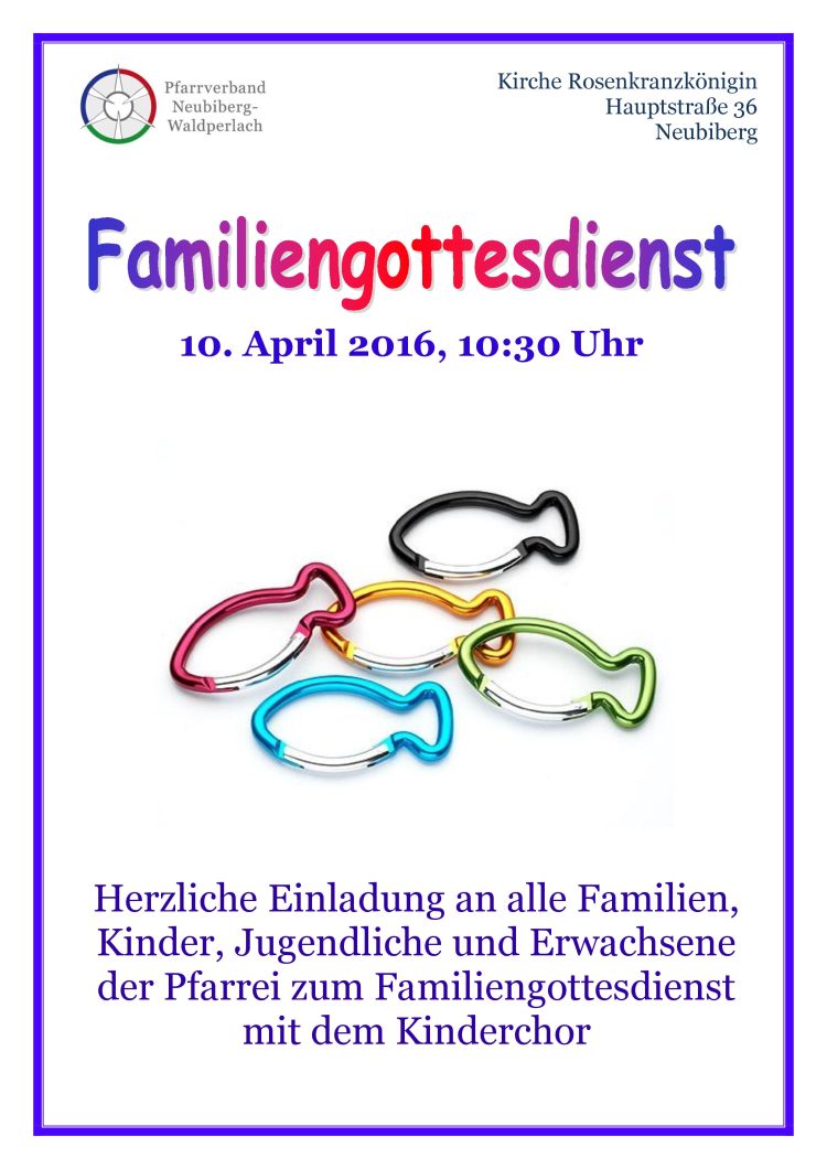 Familiengottesdienst am 10.04.2016 um 10:30 Uhr. Herzliche Einladung an alle Familien, Kinder, Jugendliche und Erwachsene der Pfarrei zum Familiengottesdienst mit dem Kinderchor in der Kirche Rosenkranzkönigin.