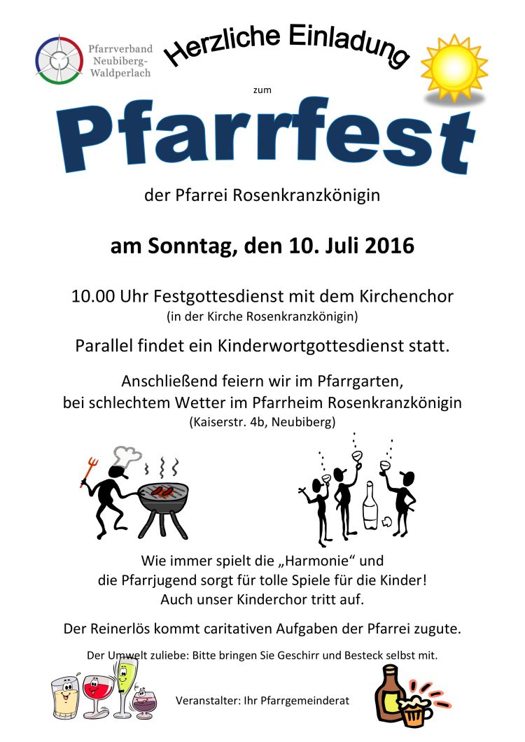 Die Pfarrei Rosenkranzkönigin Neubiberg lädt groß und klein, jung und alt zu ihrem Pfarrfest am 10. Juli 2016 herzlich ein. Das Fest beginnt um 10:00 Uhr mit einem Festgottesdienst mit dem Kirchenchor. Parallel dazu findet ein Kinderwortgottesdienst im Pfarrgarten statt. Anschließend feiern wir im Pfarrgarten - bei schlechtem Wetter im Pfarrheim Rosenkranzkönigin (Kaiserstraße 4b, 85579 Neubiberg). Es gibt Schmankerln vom Grill, Salate, viele verschiedene Getränke, Kaffee & Kuchen, u.v.m. Die Neubiberger Harmonie spielt gewohnt gut und zünftig auf und es singt der Kinderchor der Pfarrei Rosenkranzkönigin. Die kleinen Gäste können sich auf Spiel und Spaß mit der Pfarrjugend freuen. Der Reinerlös des Pfarrfestes kommt caritativen Aufgaben der Pfarrei zugute. Der Umwelt zuliebe: Bitte bringen Sie Geschirr und Besteck selbst mit.