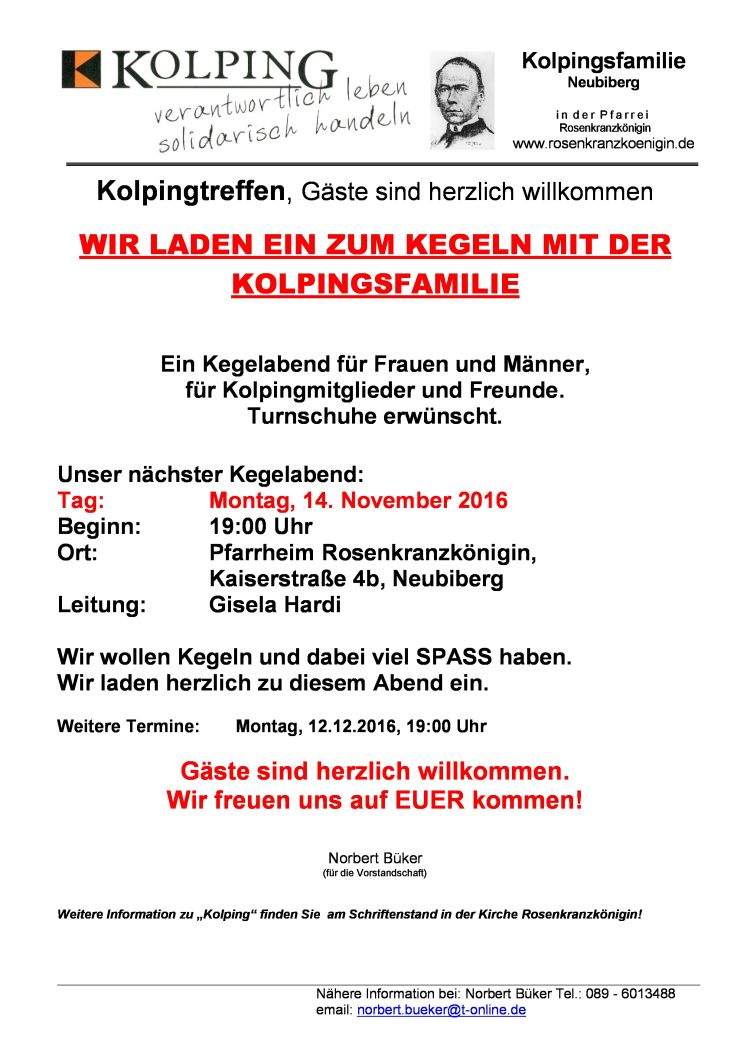 Wir laden ein zum Kegeln mit der Kolpingsfamilie Wir wollen Kegeln und dabei viel SPASS haben. Ein Kegelabend für Frauen und Männer. Turnschuhe erbeten. Tag:  Montag, den 11. Dezember 2014 Beginn: 19:00 Uhr Ort: Pfarrheim Rosenkranzkönigin, Kaiserstraße 4b Leitung: Dieter