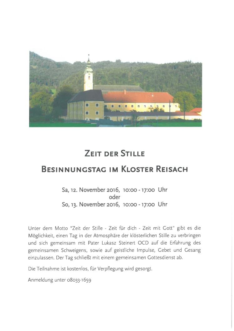 Unter dem Motto "Zeit der Stille - Zeit für dich - Zeit mit Gott" gibt es die Möglichkeit, einen Tag in der Atmosphäre der klösterlichen Stille zu verbringen und sich gemeinsam mit Pater Lukasz Steinert OCD auf die Erfahrung des gemeinsamens Schweigens, sowie auf geistliche Impulse, Gebet und Geang einzulassen. Der Tag schließt mit einem gemeinsamen Gottesdienst ab.