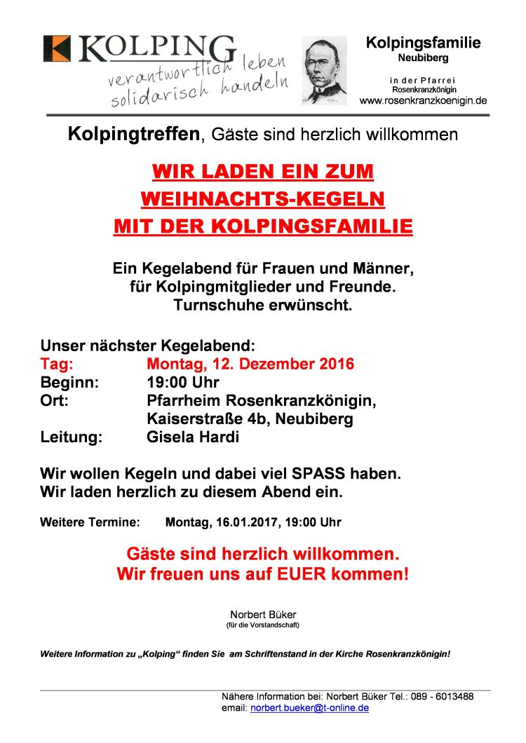 Wir laden ein zum Kegeln mit der Kolpingsfamilie Wir wollen Kegeln und dabei viel SPASS haben. Ein Kegelabend für Frauen und Männer. Turnschuhe erbeten. Tag:  Montag, den 11. Dezember 2014 Beginn: 19:00 Uhr Ort: Pfarrheim Rosenkranzkönigin, Kaiserstraße 4b Leitung: Dieter