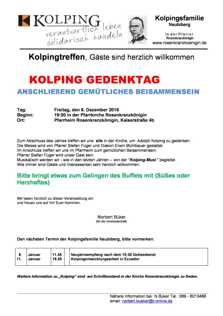 Kolping Gedenktag mit anschließndem gemütlichem Beisammensein Tag: Freitag, den 9. Dezember 2016 Beginn: 19:00 Uhr Ort: Pfarrkirche Rosenkranzkönigin, Hauptstraße 36 Zum Abschluss des Jahres treffen wir uns alle in der Kirche Rosenkranzkönigin, um Adolph Kolping zu gedenken. ... mehr