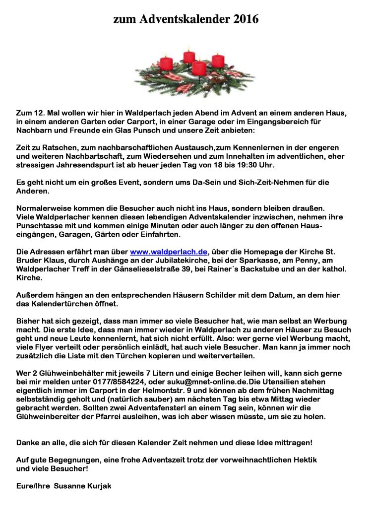 | Zum 12. Mal wollen wir hier in Waldperlach jeden Abend im Advent an einem anderen Haus, in einem anderen Garten oder Carport, in einer Garage oder im Eingangsbereich für Nachbarn und Freunde ein Glas Punsch und unsere Zeit anbieten: Zeit zu Ratschen, zum nachbarschaftlichen Austausch,zum Kennenlernen in der engeren und weiteren Nachbartschaft, zum Wiedersehen und zum Innehalten im adventlichen, eher stressigen Jahresendspurt ist ab heuer jeden Tag von 18 bis 19:30 Uhr. Es geht nicht um ein großes Event, sondern ums Da-Sein und Sich-Zeit-Nehmen für die Anderen. Normalerweise kommen die Besucher auch nicht ins Haus, sondern bleiben draußen. Viele Waldperlacher kennen diesen lebendigen Adventskalender inzwischen, nehmen ihre Punschtasse mit und kommen einige Minuten oder auch länger zu den offenen Haus-eingängen, Garagen, Gärten oder Einfahrten. Die Adressen erfährt man über www.waldperlach.de, über die Homepage der Kirche St. Bruder Klaus, durch Aushänge an der Jubilatekirche, bei der Sparkasse, am Penny, am Waldperlacher Treff in der Gänselieselstraße 39, bei Rainer´s Backstube und an der kathol. Kirche. Außerdem hängen an den entsprechenden Häusern Schilder mit dem Datum, an dem hier das Kalendertürchen öffnet. Bisher hat sich gezeigt, dass man immer so viele Besucher hat, wie man selbst an Werbung macht. Die erste Idee, dass man immer wieder in Waldperlach zu anderen Häuser zu Besuch geht und neue Leute kennenlernt, hat sich nicht erfüllt. Also: wer gerne viel Werbung macht, viele Flyer verteilt oder persönlich einlädt, hat auch viele Besucher. Man kann ja immer noch zusätzlich die Liste mit den Türchen kopieren und weiterverteilen. Wer 2 Glühweinbehälter mit jeweils 7 Litern und einige Becher leihen will, kann sich gerne bei mir melden unter 0177/8584224, oder suku@mnet-online.de.Die Utensilien stehen eigentlich immer im Carport in der Helmontstr. 9 und können ab dem frühen Nachmittag selbstständig geholt und (natürlich sauber) am nächsten Tag bis etwa Mittag wieder gebracht werden. Sollten zwei Adventsfensterl an einem Tag sein, können wir die Glühweinbereiter der Pfarrei ausleihen, was ich aber wissen müsste, um sie zu holen. Danke an alle, die sich für diesen Kalender Zeit nehmen und diese Idee mittragen! Auf gute Begegnungen, eine frohe Adventszeit trotz der vorweihnachtlichen Hektik und viele Besucher! Susanne Kurjak