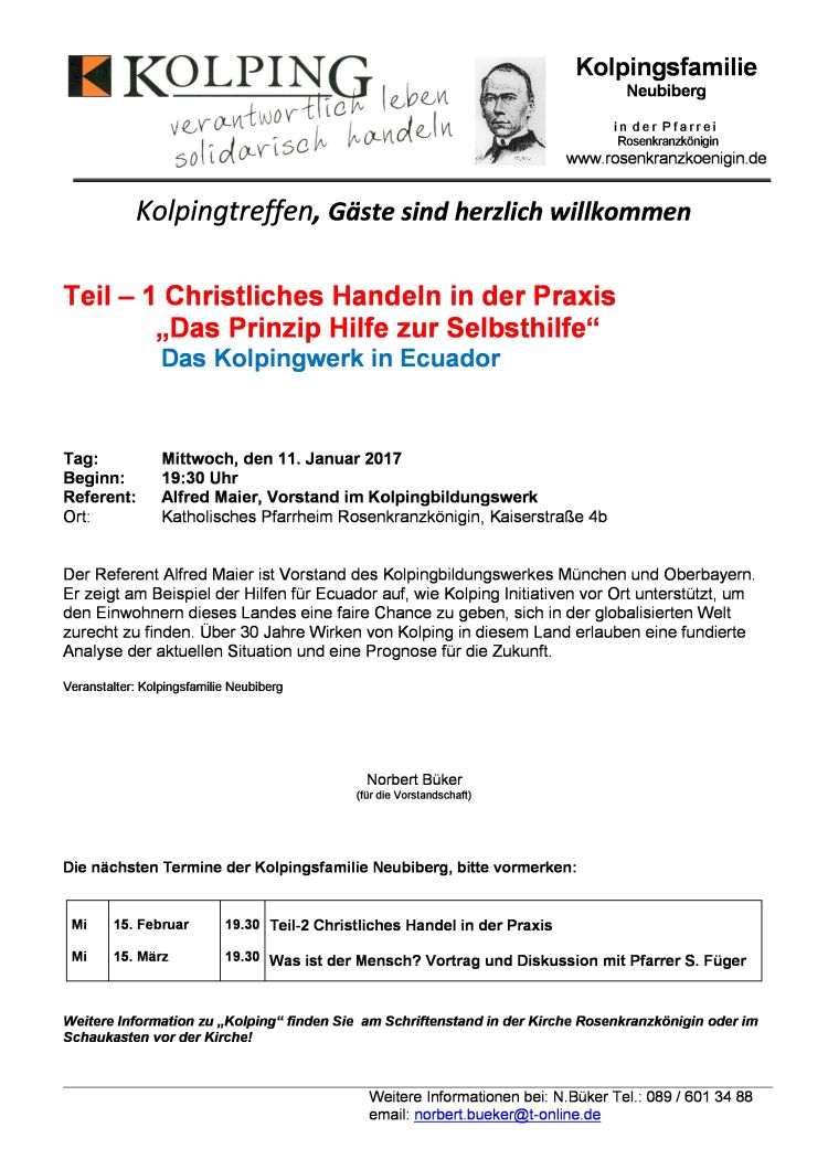 Tag: Mittwoch, den 11. Januar 2017 Beginn: 19:30 Uhr Referent: Alfred Maier, Vorstand im Kolpingbildungswerk Ort: Katholisches Pfarrheim Rosenkranzkönigin, Kaiserstraße 4b Der Referent Alfred Maier ist Vorstand des Kolpingbildungswerkes München und Oberbayern. Er zeigt am Beispiel der Hilfen für Ecuador auf, wie Kolping Initiativen vor Ort unterstützt, um den Einwohnern dieses Landes eine faire Chance zu geben, sich in der globalisierten Welt zurecht zu finden. Über 30 Jahre Wirken von Kolping in diesem Land erlauben eine fundierte Analyse der aktuellen Situation und eine Prognose für die Zukunft. Veranstalter: Kolpingsfamilie Neubiberg