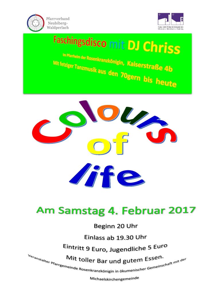 Unter dem Motto "Colours Of Life" laden die kath. Pfarrei Rosenkranzkönigin und die ev. luth. Michaelskirchengemeinde am Samstag, den 4. Februar 2017, zum ökumenischen Faschingsball in das Pfarrheim Rosenkranzkönigin, Kaiserstraße 4b, Neubiberg herzlich ein.