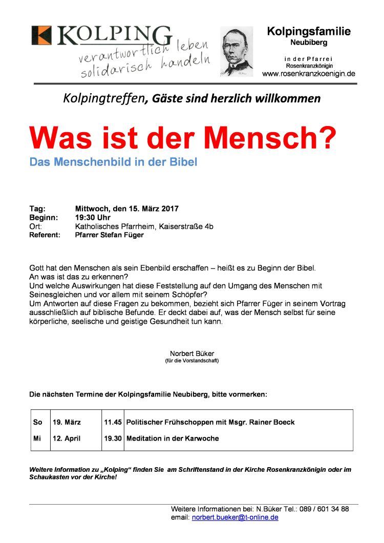 Referentin: Msgr. Christoph Huber, Präses Kolpingwerk Bayern Ort: Katholisches Pfarrheim, Kaiserstraße 4b, Neubiberg