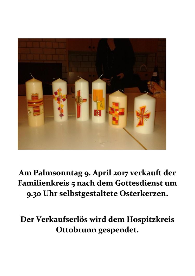 Am Palmsonntag, den 09.04.2017, verkauft der Familienkreis 5 nach dem 09:30 Uhr-Gottesdienst auf dem Kirchvorplatz Rosenkranzkönigin selbstgestaltete Osterkerzen. Der Verkaufserlös wird dem