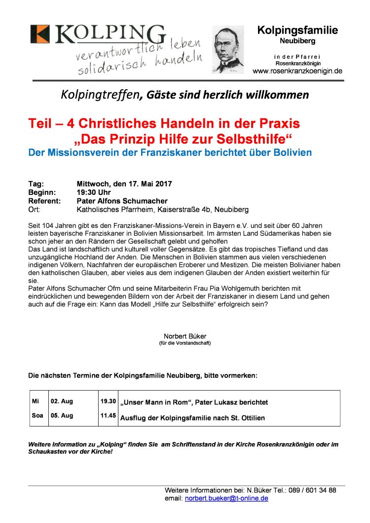 Christliches Handeln in der Praxis (Teil 5): "Das Prinzip Hilfe zur Selbsthilfe" am Beispiel von missio Tag: Mittwoch, den 19. Juli 2017 Beginn: 19:30 Uhr Referent: Msgr. Wolfgang Huber, Domkapitular Ort: Katholisches Pfarrheim Rosenkranzkönigin, Kaiserstraße 4b, Neubiberg Der ... mehr
