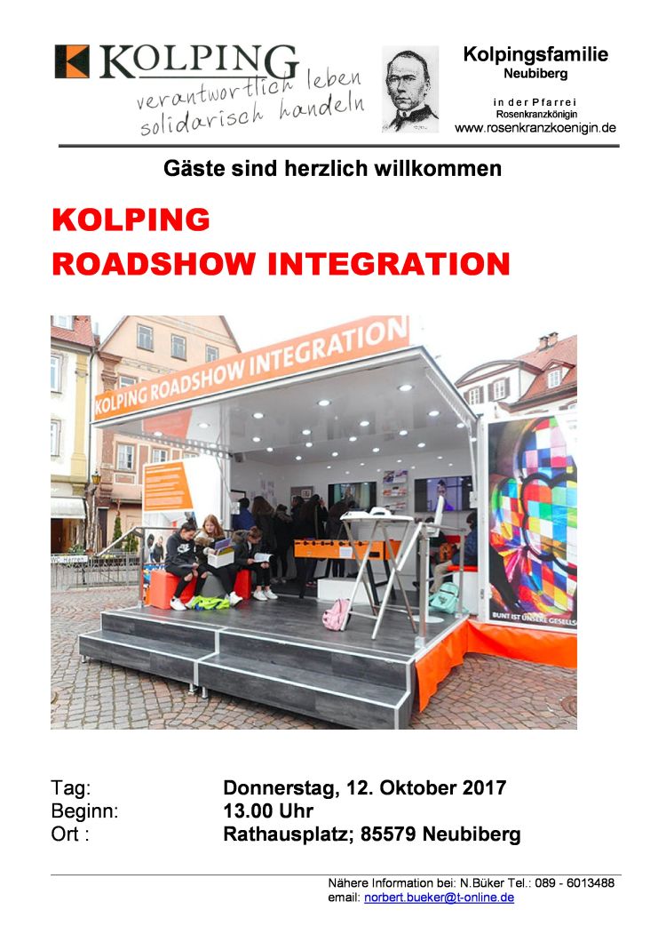 Am 11.03.2018 feiert die Kolpingsfamilie Neubiberg ihr 30 jähriges Jubiläum mit einem Festgottesdienst um 10:30 Uhr. Zelebranten: Bundespräses Josef Holtkotte Diözesanpräses Christoph Huber Pfarrer Stefan Füger Pfarrer Siegfried Bleichner Festpredigt: ... mehr
