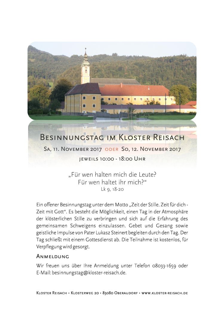 Wir freuen uns über Ihre Anmeldung unter Telefon 08033/1659 oder E-Mail besinnungstag@kloster-reisach.de
