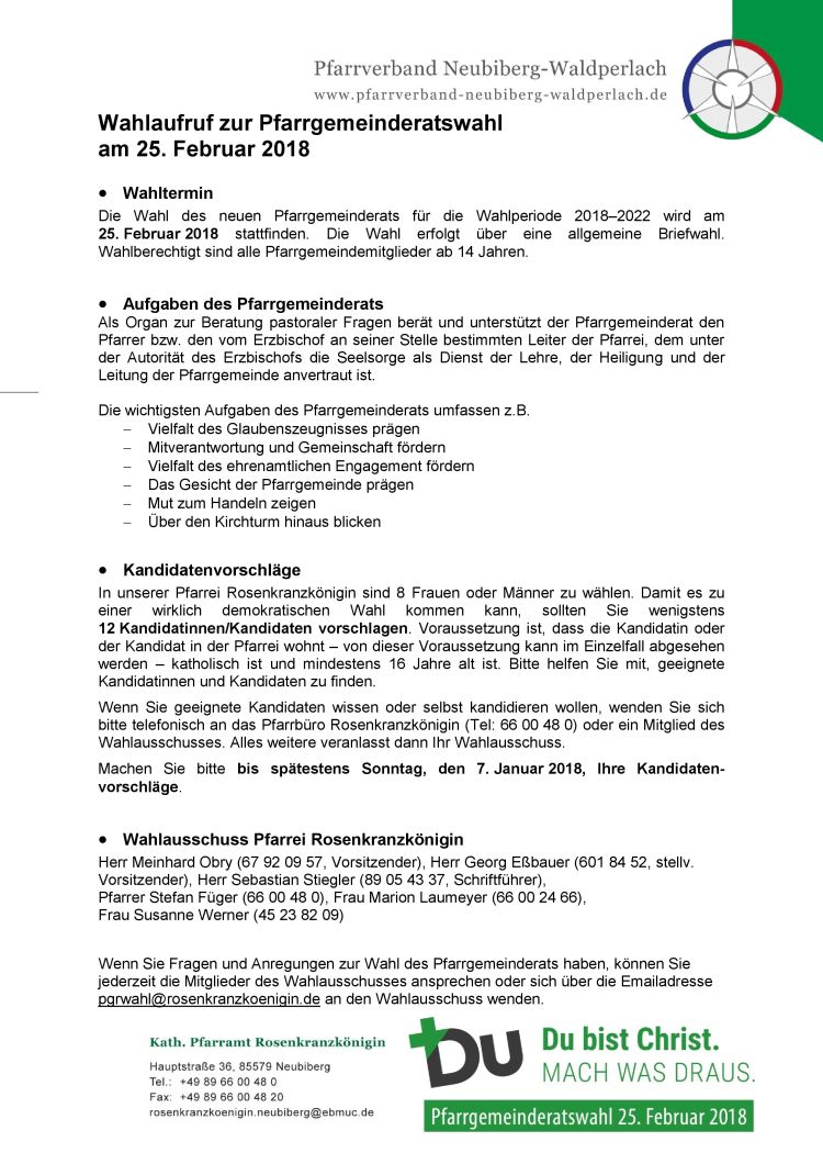 Wahlaufruf zur Pfarrgemeinderatswahl am 25. Februar 2018 in der Pfarrei Rosenkranzkönigin