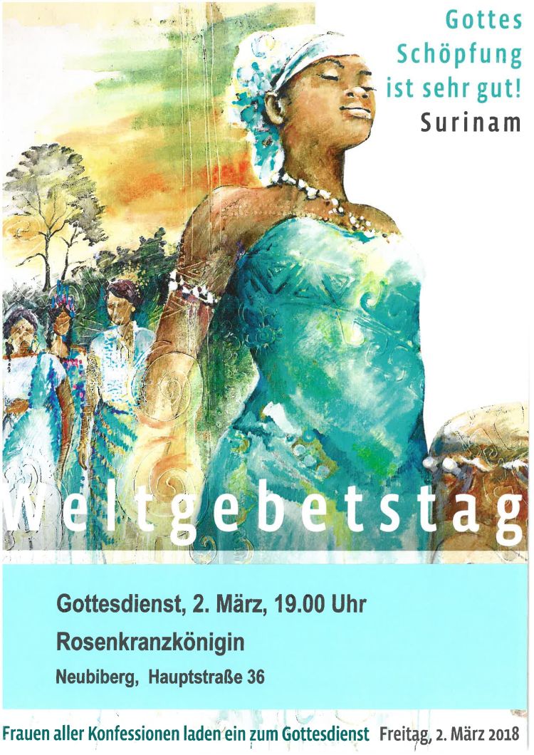 Herzliche Einladung zum ökumenischen Weltgebetstag zum Thema "Gottes Schöpfung ist sehr gut! Surinam" am Sonntag, den 02.03.2018, um 19:00 Uhr in der Pfarrkirche Rosenkranzkönigin, Hauptstraße 36, Neubiberg.