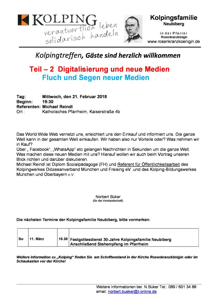 Tag: Mittwoch, den 21. Februar 2018 Beginn: 19:30 Uhr Referent: Michael Reindl Ort: Katholisches Pfarrheim Rosenkranzkönigin, Kaiserstraße 4b Das World Wide Web vernetzt uns, erleichtert uns den Einkauf und informiert uns. Die ganze Welt kann in der gesamten Welt einkaufen. Wir ... mehr