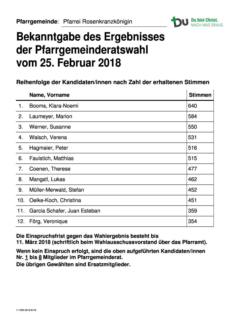 Wenn kein Einspruch erfolgt, sind die oben aufgeführten Kandidaten/innen Nr. 1 bis 8 Mitglieder im Pfarrgemeinderat. Die übrigen Gewählten sind Ersatzmitglieder
