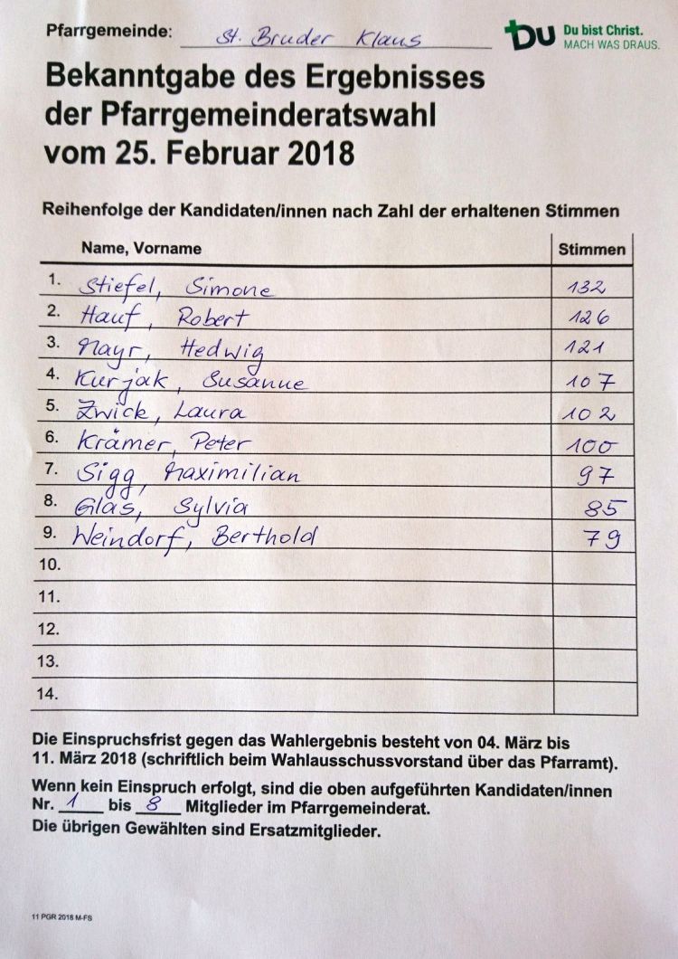 Wenn kein Einspruch erfolgt, sind die oben aufgeführten Kandidaten/innen Nr. 1 bis 8 Mitglieder im Pfarrgemeinderat. Die übrigen Gewählten sind Ersatzmitglieder