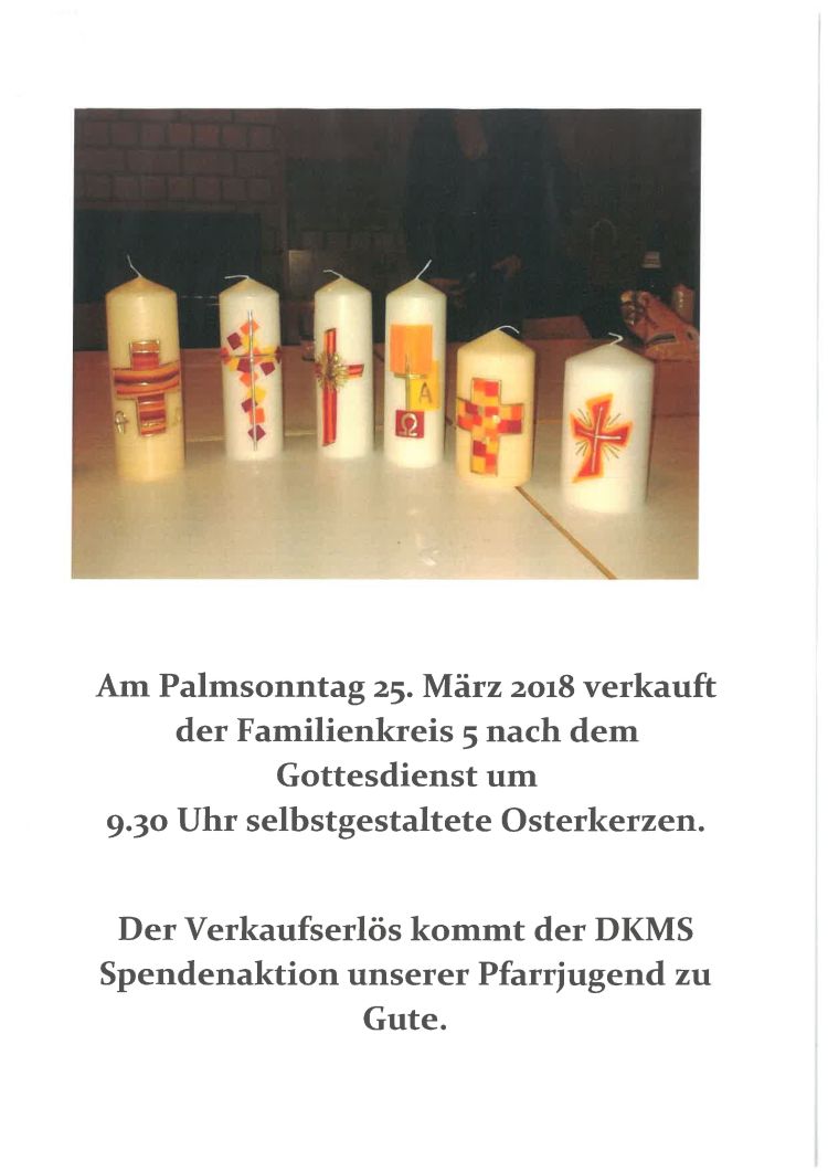Am Palmsonntag, den 25.03.2018, verkauft der Familienkreis 5 nach dem Gottesdienst (ca. 10:45 Uhr) selbstgestaltete Osterkerzen vor der Kirche Rosenkranzkönigin (Neubiberg). Der Verkaufserlös kommt der CKMS Spendenaktion unserer Pfarrjugend Neubiberg zu Gute.