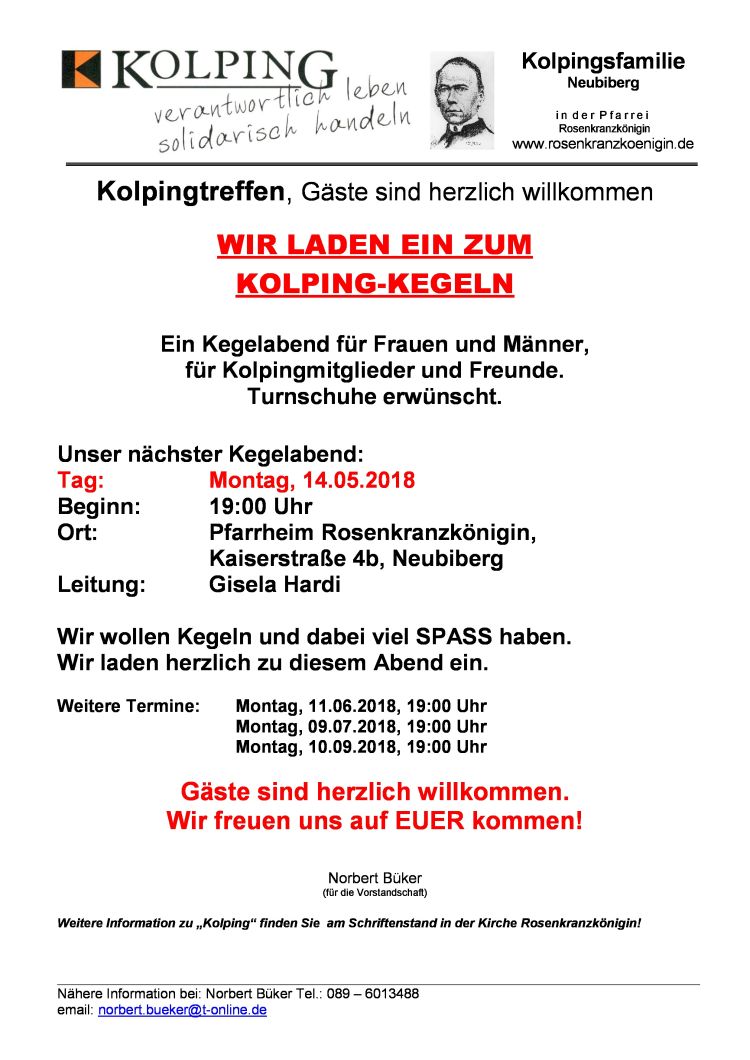 Tag: Mittwoch, den 5. Oktober 2016 Beginn: 19:00 Uhr Ort: Haus für Weiterbildung (2. Stock), Rathausplatz, Neubiberg Eintritt (Weine & ... mehr Wir laden ein zum Kegeln mit der Kolpingsfamilie: