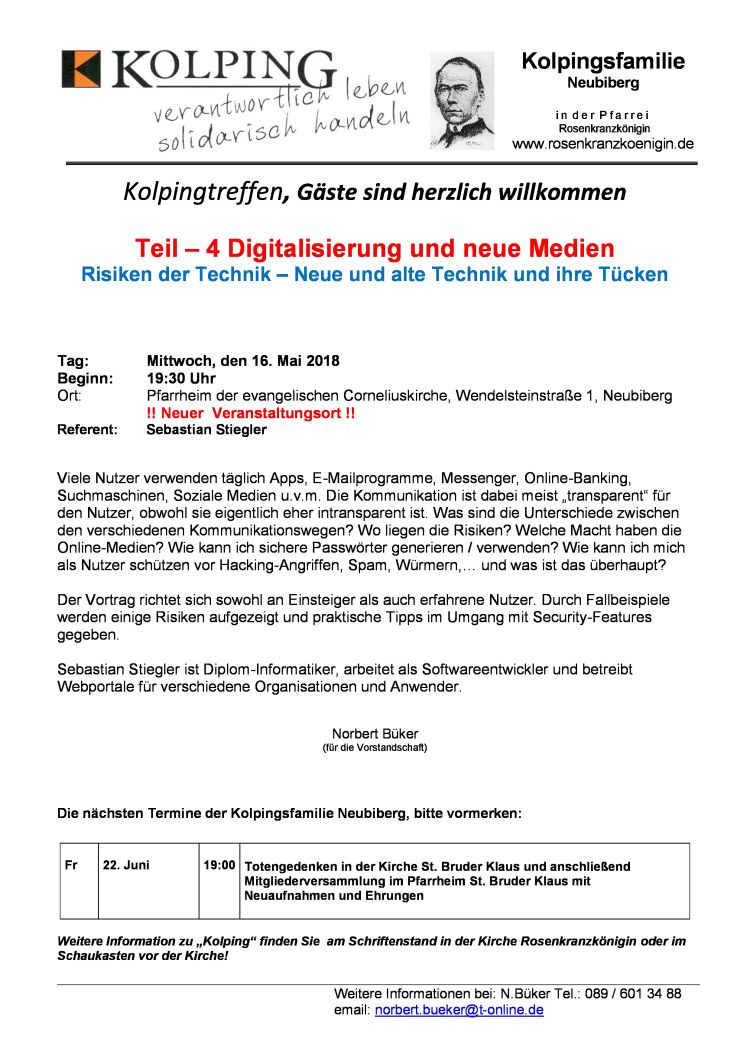 Die neuen Medien erlauben Kommunikation in Sekundenschnelle rund um die Erde. Auch hier erfahren im Namen der Meinungs- und ... mehr Kolpingbruder und Diakon Erwin Mühlbauer lädt ein zur gemeinsamen Einstimmung auf die Kartage und das Osterfest am Mittwoch, den 28. März 2018, um 19:30 Uhr ins Katholische Pfarrheim Rosenkranzkönigin, Kaiserstraße 4b, Neubiberg.