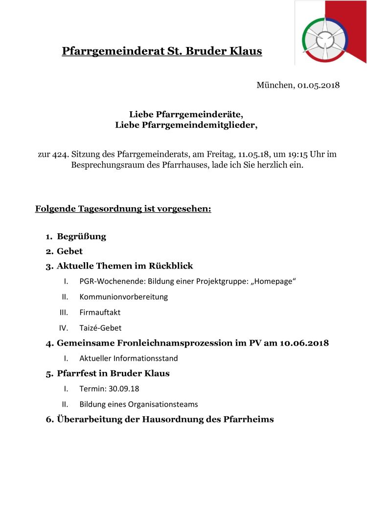 zur 424. Sitzung des Pfarrgemeinderats, am Freitag, 11.05.18, um 19:15 Uhr im