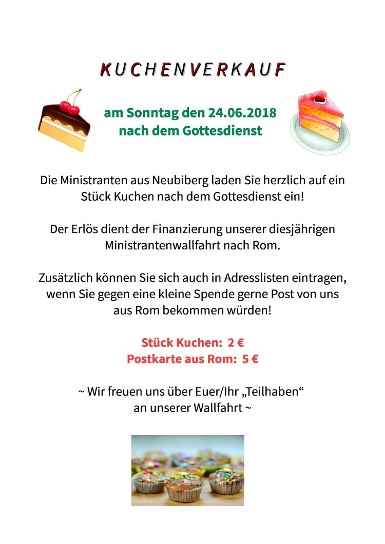 Kuchenverkauf am Sonntag, den 24.06.2018, nach dem Gottesdienst