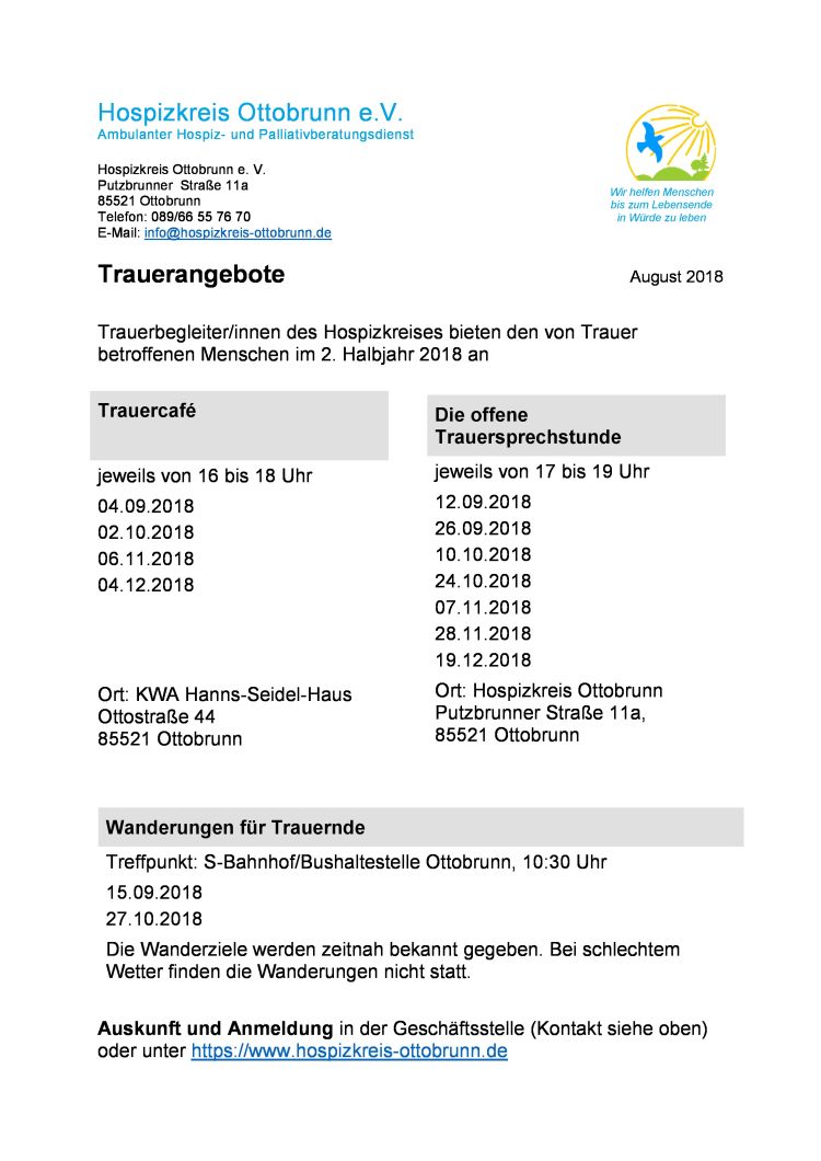 Trauerbegleiter/innen des Hospizkreises bieten den von Trauer betroffenen Menschen im 2. Halbjahr 2018 an