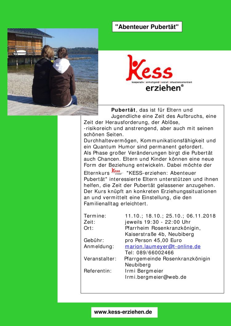 Als Phase großer Veränderungen birgt die Pubertät auch Chancen. Eltern und Kinder können eine neue Form der Beziehung entwickeln. Dabei möchte der Elternkurs "KESS-erziehen: Abenteuer Pubertät" interessierte Eltern unterstützen und ihnen helfen, die Zeit der Pubertät gelassener anzugehen.