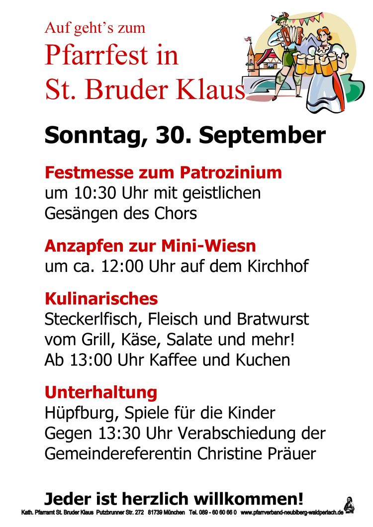 Am Sonntag, den 30. September, feiern wir in der Pfarrei St. Bruder Klaus in Waldperlach das Patrozinium. Der Festgottesdienst in der Kirche beginnt um 10:30 Uhr. Im Anschluss daran beginnt der geselligen Teil des Pfarrfestes mit dem Anzapfen des ersten Bierfasses (ca. 12:00 Uhr).