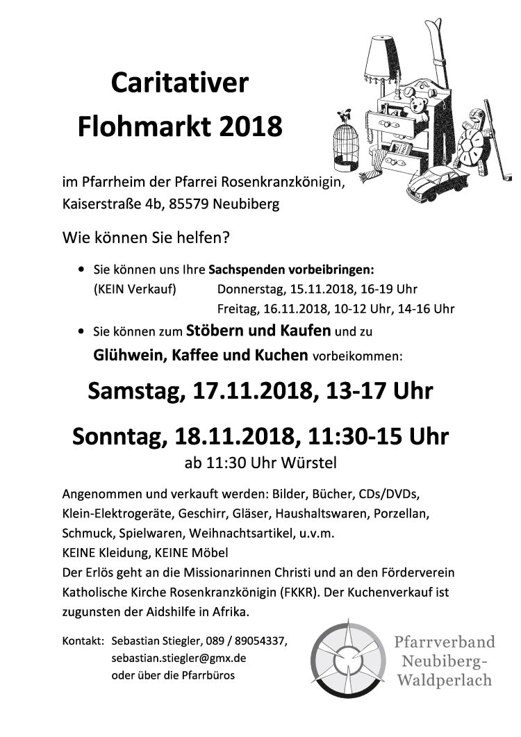 Am 17. und 18. November findet im Pfarrheim Rosenkranzkönigin, Kaiserstraße 4b, 85579 Neubiberg wieder ein großer Flohmarkt statt. Verkauft werden gespendete Artikel, die am Donnerstag, den 15.11.2018, von 16 bis 19 Uhr, und am Freitag, den 16.11.2018, von 10 bis 12 Uhr und von 14 bis 16 Uhr ebenfalls im Pfarrheim abgegeben werden können.