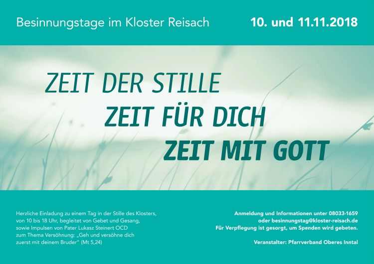 Herzliche Einladung zu einem Tag der Stille des Klosters, von 10 bis 18 Uhr, begleitet von Gebet und Gesang, sowie Impulsen von Pater Dr. Lukasz Steinert OCD zum Thema "Geh und versöhne dich zuerst mit deinem Bruder" (Mt 5,24).