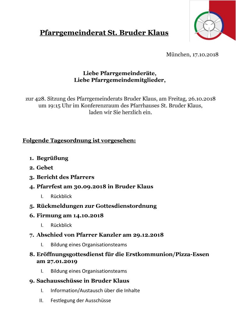zur 428. Sitzung des Pfarrgemeinderats Bruder Klaus, am Dienstag, 26.10.18