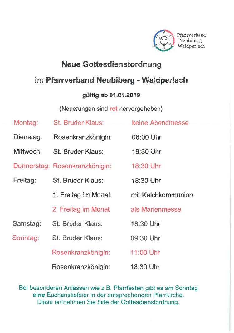 In unserem Pfarrverband wird es demzufolge ab dem 1.1.2019 an den Werktagen von Dienstag bis Freitag zwei Hl. Messen in Rosenkranzkönigin (Dienstag um 08:00 Uhr, Donnerstag um 18:30 Uhr) und zwei Hl. Messen in St. Bruder Klaus (Mittwoch um 18:30 Uhr, Freitag um 18:30 Uhr) geben.